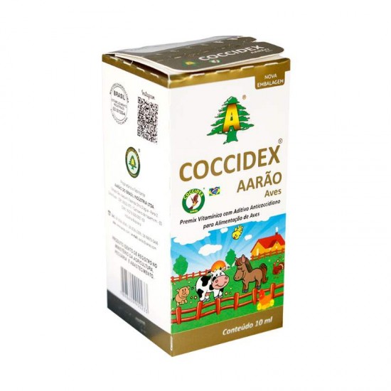 O Coccidex - Aarão é um premix vitamínico complementar com Aditivo Anticoccidiano, indicado para Aves na prevenção da coccidiose causada por Eimeria acervulina, E. brunetti, E. necatrix, E. maxima, E. tenella, E. mivati, E. mitis, E. praecox; podendo ser usado em Aves de todas as idades.