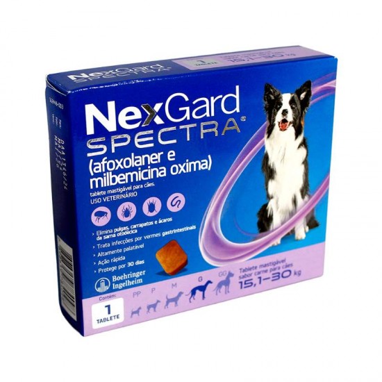 Referência no tratamento contra pulgas, carrapatos, sarna e vermes, o Antipulgas e Carrapatos NexGard Spectra para Cães de 15,1 a 30 Kg é comprovadamente seguro para cães de qualquer raça e conta com uma linha completa para atender diferentes portes e pesos. Pode ser administrado em cães adultos e filhotes a partir de oito semanas de vida e pesando acima de 2kg. Nexgard Spectra tem um rápido início de ação e atinge 100% de eficácia em 8 horas para pulgas. O NexGard spectra funciona por 30 dias. Para manter seu pet livre de pulga, carrapato, sarna e vermes, faça o tratamento mensal.