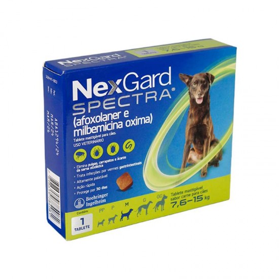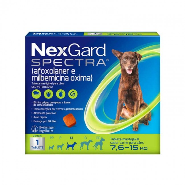 Referência no tratamento contra pulgas, carrapatos, sarna e vermes, o Antipulgas e Carrapatos NexGard Spectra para Cães de 7,6 a 15 Kg é comprovadamente seguro para cães de qualquer raça e conta com uma linha completa para atender diferentes portes e pesos. Pode ser administrado em cães adultos e filhotes a partir de oito semanas de vida e pesando acima de 2kg. Nexgard Spectra tem um rápido início de ação e atinge 100% de eficácia em 8 horas para pulgas. O NexGard spectra funciona por 30 dias. Para manter seu pet livre de pulga, carrapato, sarna e vermes, faça o tratamento mensal.