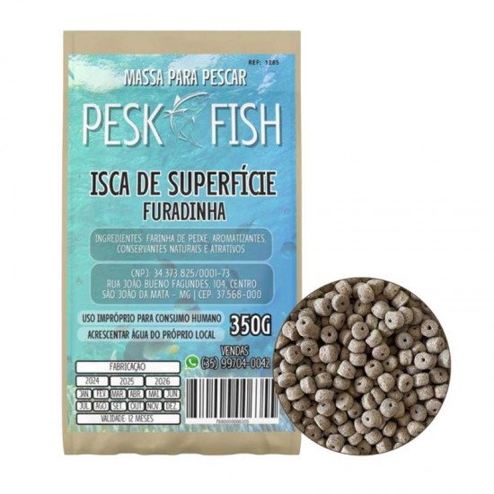 A Massa para Pescar Pesk Fish Isca de Superfície Furadinha é ideal para atrair peixes de forma prática e eficiente. Produzida com farinha de peixe, aromatizantes, conservantes naturais e atrativos, garante excelente desempenho na pesca. Em formato furadinho, facilita o uso direto no anzol ou com acessórios de pesca. O produto deve ser hidratado com água do próprio local para maior eficiência.