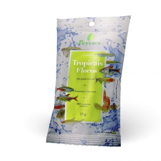 Indicação do Produto: Poytara Tropicais Flocos foi desenvolvido e aperfeiçoado para os habitantes de aquários comunitários. Produto processado por laminação e hidratado gradativamente, pertence ao grupo de alimentos da Categoria Tropicais. As alterações em alguns parâmetros nutricionais promovem maior integridade dos ingredientes submetidos a este tipo de processo: possui nível de proteína mais elevado e suplementação maior de vitaminas e minerais. Preparado com ingredientes digestíveis e palatáveis que otimizam a vitalidade dos peixes.