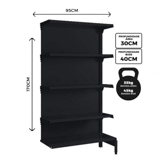 A estrutura em aço com acabamento em pintura eletrostática proporciona durabilidade e resistência. A gôndola oferece 5 bandejas ajustáveis, com capacidade para suportar até 45kg nas bases e 35kg nas aéreas. Ideal para organização e exposição de pequenas cargas em ambientes comerciais. Seu design permite fácil montagem quando combinada com a gôndola inicial. A coluna de parede oferece estabilidade, tornando o produto funcional e eficiente para diferentes tipos de estabelecimentos.