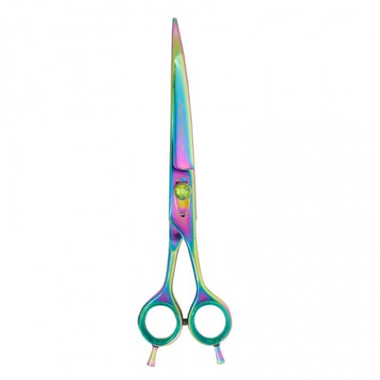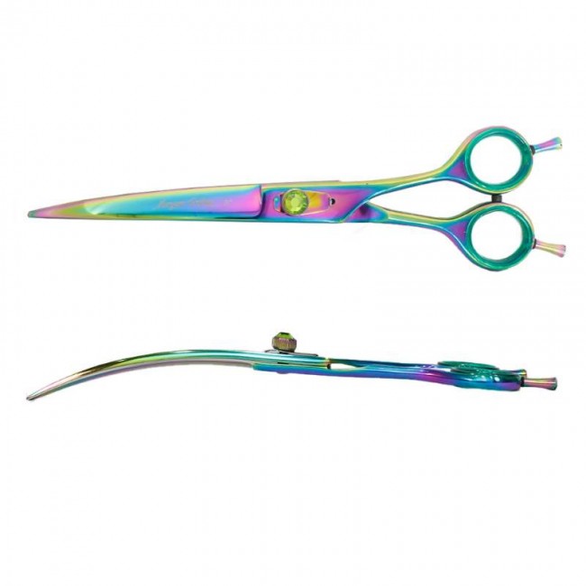 • TESOURA EM ACO 420, COM DOIS PINOS, COM AFIACAO TIPO NAVALHA, ESTILO CURVA E NA FURTA COR