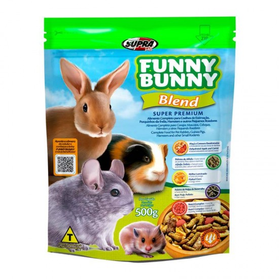A ração funny bunny roedores blend supra é um alimento extrusado com vitaminas e minerais e alfafa, fonte de fibras essenciais.
