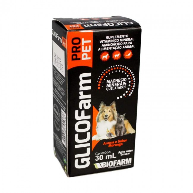 Glicofarm Pet® 30ml Biofarm auxilia na suplementação de aminoácidos e vitaminas do complexo B em caninos, felinos, aves, mustelídeos, répteis e roedores, contribuindo com a melhora geral de animais com estado nutricional inadequado. Glicofarm Pet® 30ml Biofarm também estimula o apetite, além de ser um energético indicado para o preparo de animais de exposição e em treinamento.